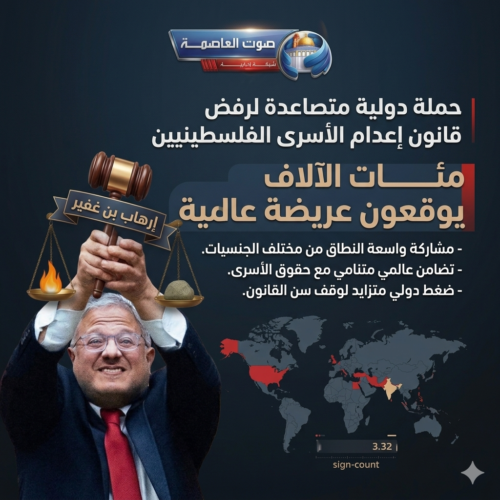 صوت العاصمة :تشهد حملة دولية واسعة رفضًا متصاعدًا لما يُعرف بـ”قانون إعدام الأسرى الفلسطينيين”، حيث تجاوز عدد الموقعين على عريضة إلكترونية أطلقتها منظمة Avaaz أكثر من 402 ألف شخص، مع دعوات للوصول إلى نصف مليون توقيع خلال الأيام المقبلة.