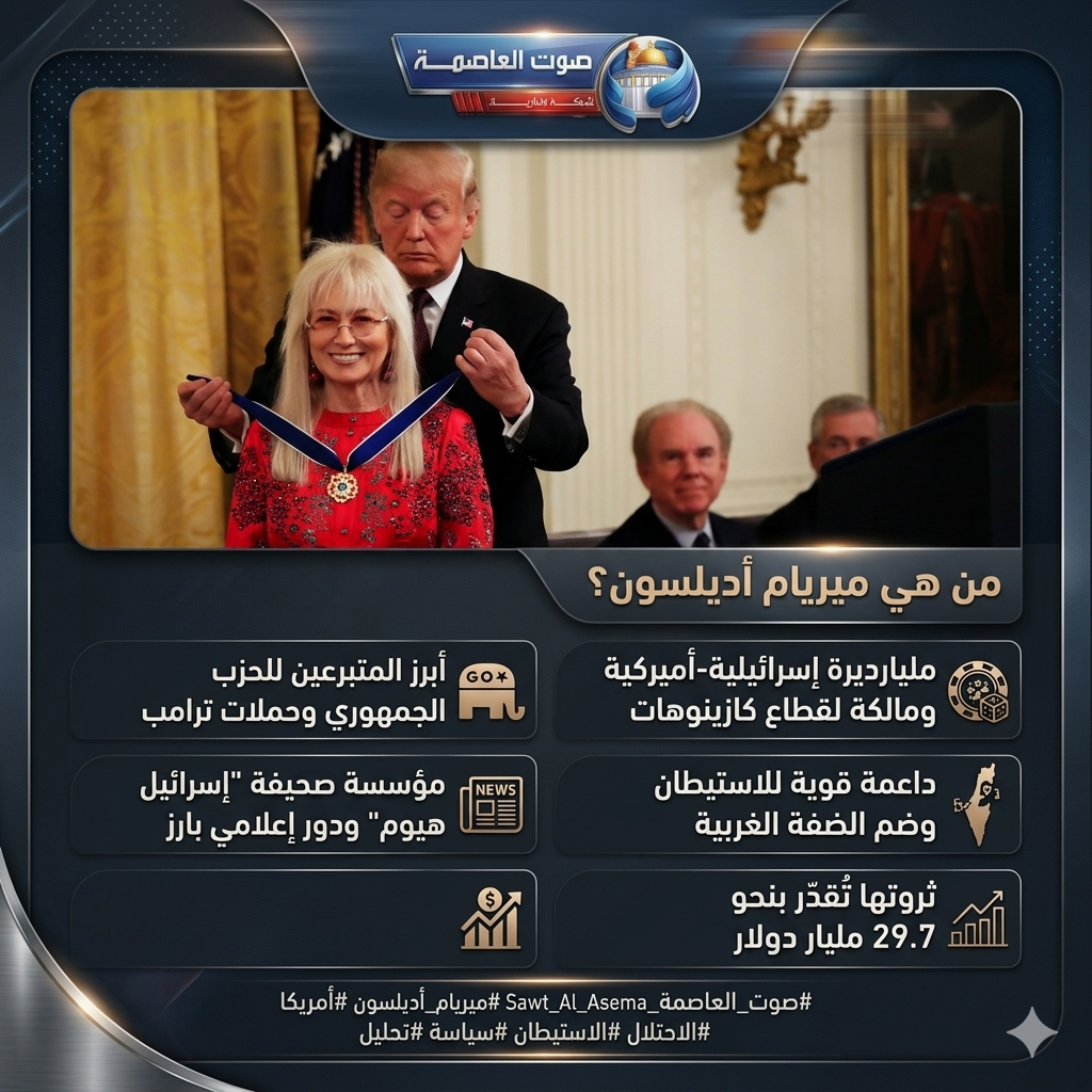 صوت العاصمة :تصدّر اسم ميريام أديلسون وسائل الإعلام خلال الساعات الماضية، باعتبارها واحدة من أبرز الشخصيات تأثيرًا في المشهدين السياسي والإعلامي المرتبطين بدولة الاحتلال.