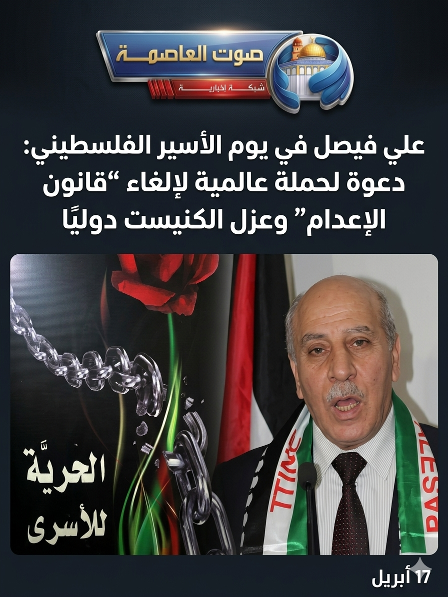 صوت العاصمة :في الذكرى السنوية ليوم الأسير الفلسطيني، دعا نائب رئيس المجلس الوطني الفلسطيني ونائب الأمين العام للجبهة الديمقراطية لتحرير فلسطين، علي فيصل، إلى تحويل هذا اليوم إلى حملة عالمية شعبية ورسمية لإلغاء ما وصفه بـ«قانون الإعدام الإسرائيلي» بحق الأسرى، والعمل على الإفراج عنهم، ومحاسبة الاحتلال على تشريعاته التي اعتبرها «جرائم حرب».