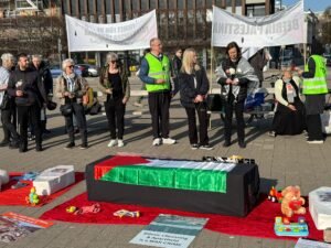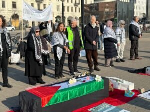 وشهدت الوقفة رفع الأعلام الفلسطينية وإطلاق الهتافات الداعمة، إلى جانب أداء أغانٍ سويدية تضامنية مع غزة وفلسطين، فيما جاب المشاركون محيط الفعالية حاملين مجسمات لأطفال شهداء من غزة ووضعوا الورود عليها.