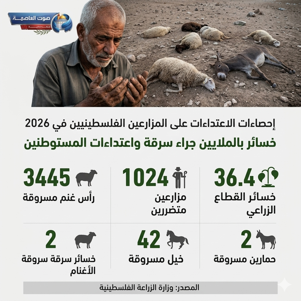 صوت العاصمة:يشهد القطاع الزراعي في فلسطين خسائر متراكمة تُقدَّر بالملايين، نتيجة تزايد حوادث سرقة المواشي والاعتداءات التي يتعرض لها المزارعون في مناطق مختلفة من الضفة الغربية، في ظل توتر ميداني مستمر وقيود على الحركة والوصول إلى الأراضي.